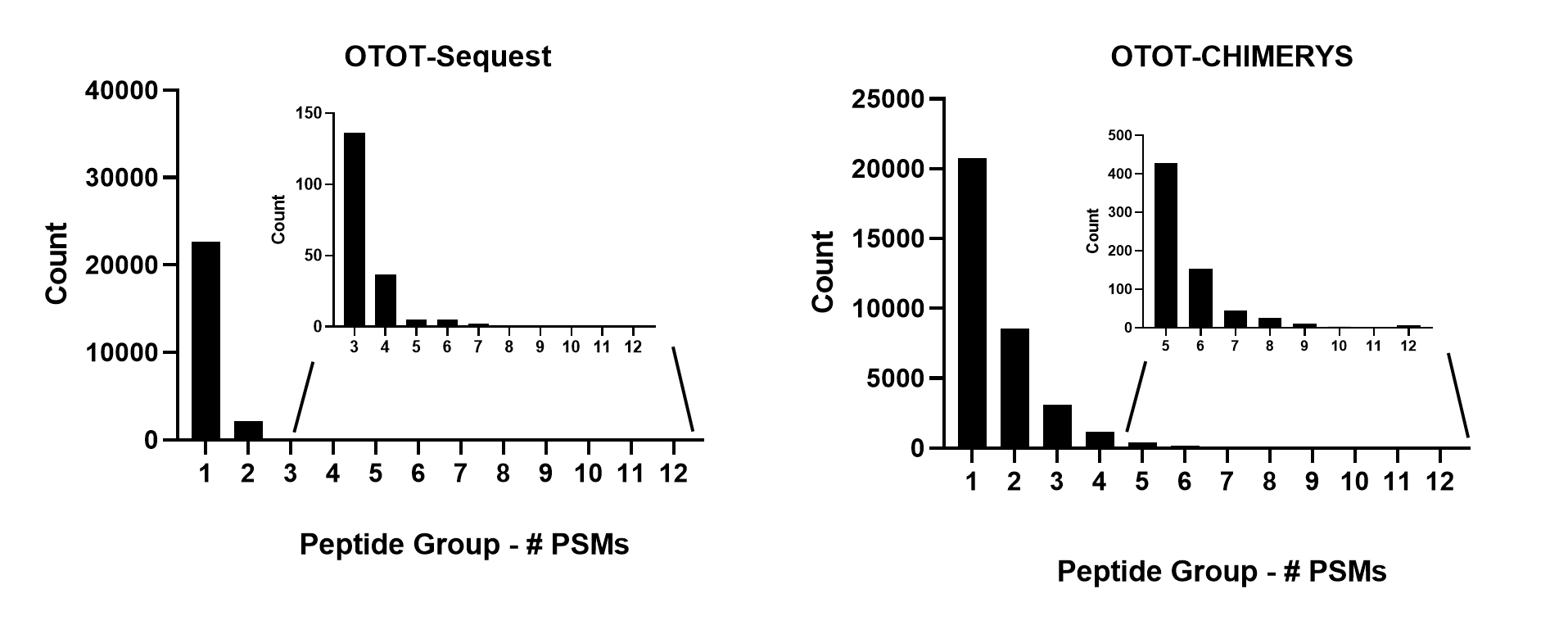 OTOT 와 OTIT에서 Sequest HT와 CHIMERYS의 Peptide/PSM 비교