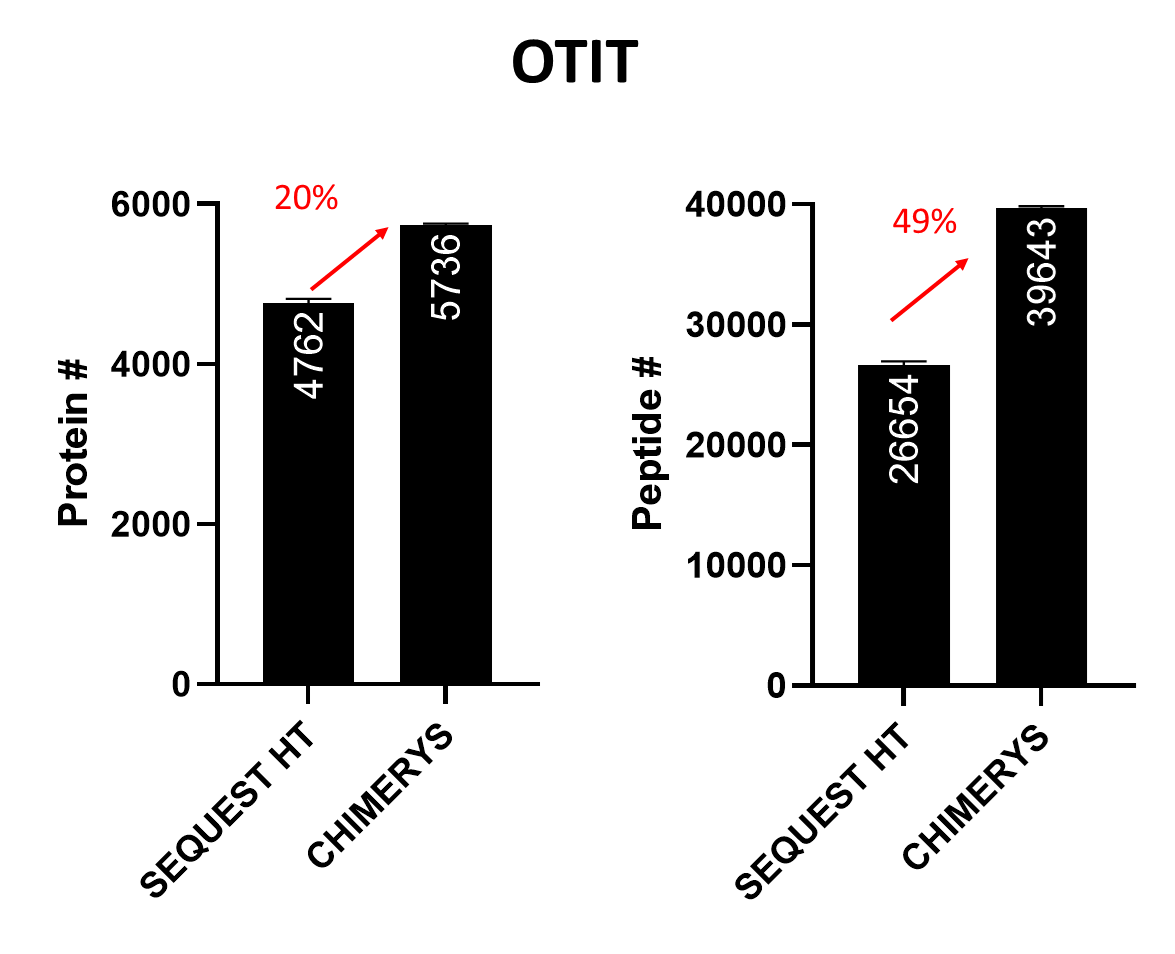 OTOT 와 OTIT에서 Sequest HT와 CHIMERY 단백질과 펩타이드 검출수 비교