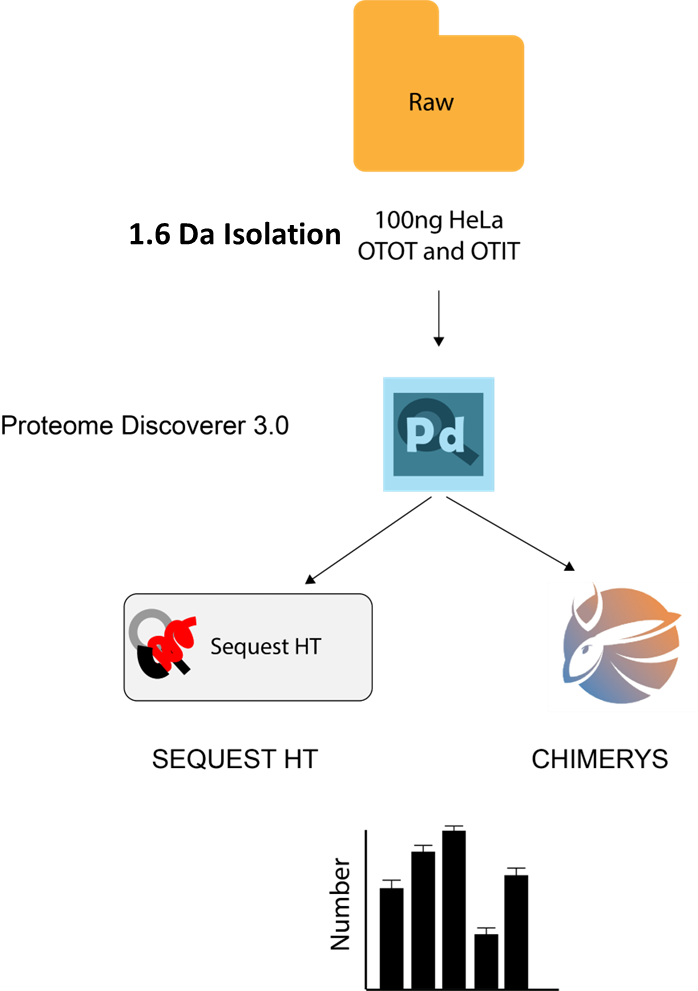 이론적으로 CHIMERY는 OTOT 분석에 최적화 되어 있습니다. MS2 스펙트럼이 더 복잡해 질 수록 효과가 더 증대됩니다. 이러한 이유로 LC-MS/MS 부분에서 wide isolation을 사용하여 최대한 많은 펩타이드를 fragmentation 시킨후 CHIMERYS로 검출합니다. 그러기 위해서는 high-resolution MS2 (OTOT)스펙트럼이 필요합니다.