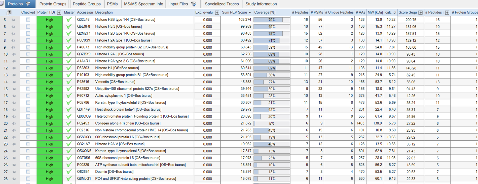 - 아래는 검색후 얻어진 결과입니다. Histone이 가장 많이 검출이 되었고 다른 단백질도 검출이 되었습니다.
