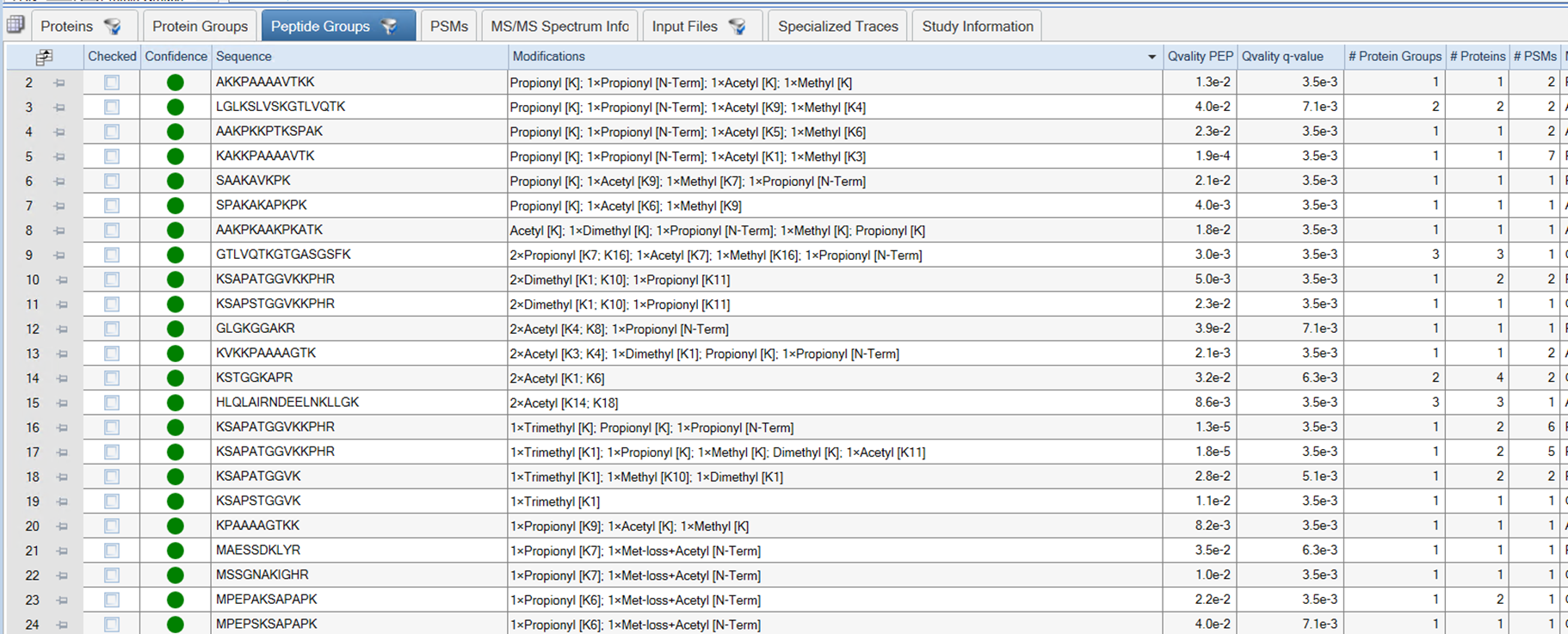 - 펩타이드 결과를 보게 되면 대부분의 펩타이드가 Propionylation이 되어 있습니다. 시료전처리가 아주 잘된것을 확인하였습니다