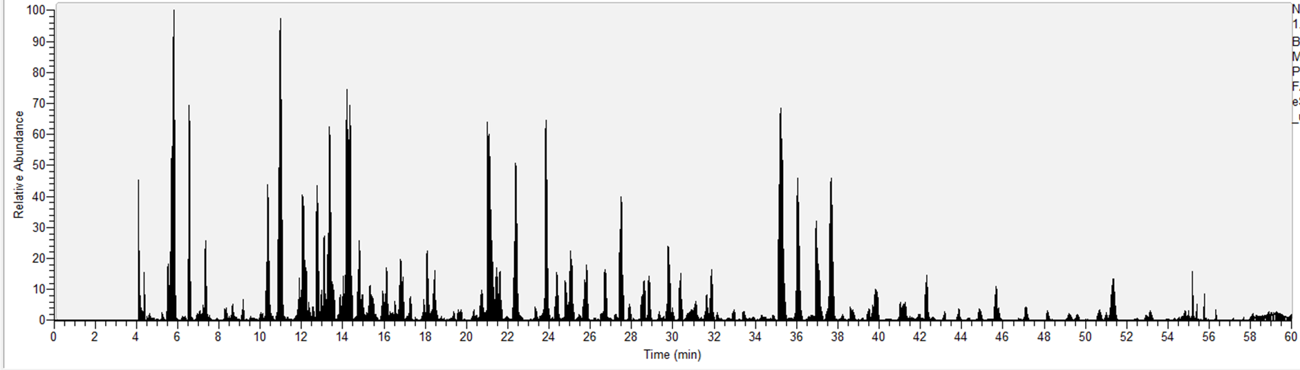 - 아래는 Calf Thymus histone을 100ng을 분석한 크로마토그램입니다. Propionylation을 하지 않을 경우 대부분의 펩타이드는 아주 작은 조각으로 되어서 이런 크로마토그램이 나오지 않습니다