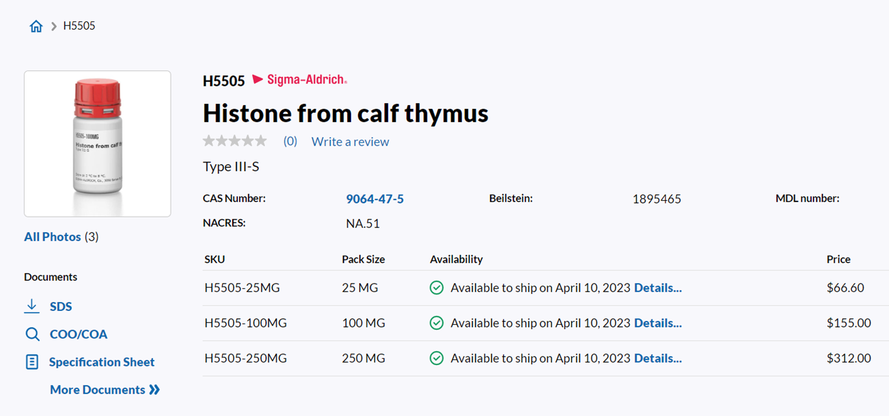 - 저렴하게 구매할수 있는것이 Signma Aldrich에서 판매하는 Calf Thymus histone입니다. 25mg에 70불 정도 하니깐 아주 저렴합니다. 보통한번 분석에 50ug정도 사용하니깐 충분한 양입니다.