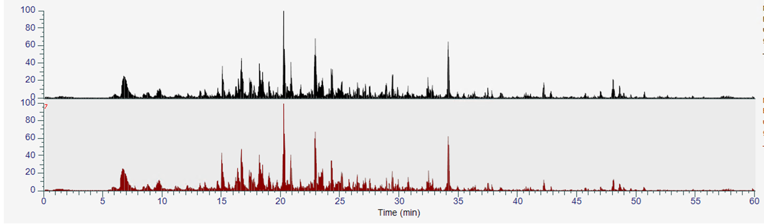 아래는 Orbitrap Eclipse (FAIMS)를 이용하여 60min LC gardient에서 분석한 100pg HeLa standard의 크로마토그램입니다.