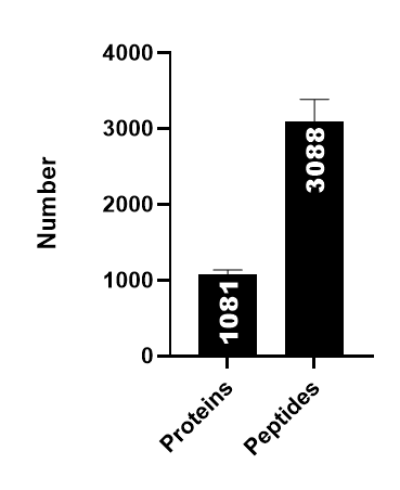 검출된 단백질과 펩타이드 수입니다. 이전의 결과와 유사하게 약 1,000개의 단백질이 검출이 되었습니다. 예상보다 좋은 결과입니다.