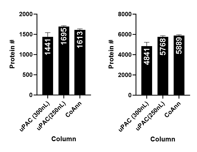 하지만 예상과는 다르게 단백질/펩타이드 검출수는 uPAC컬럼이 약간 더 높습니다. 비슷하거나 약간만 적어도 만족할려고 했는데 오히려 높은 숫자를 얻었습니다.