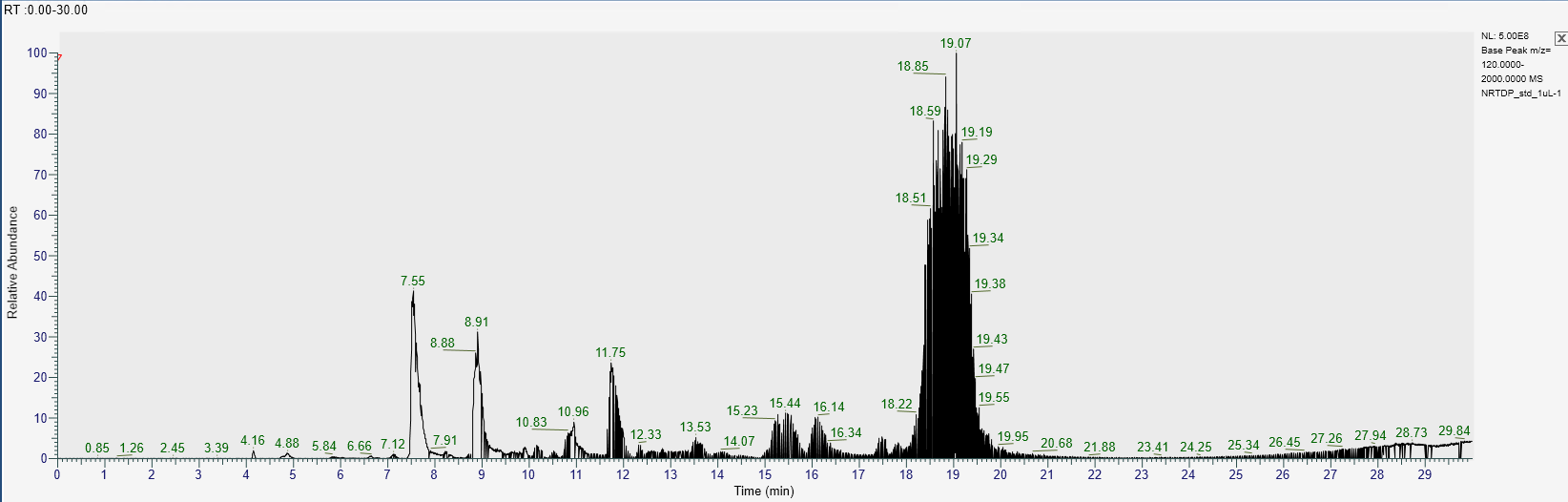 아래는 Nano LC system에서 얻어진 크로마토그램입니다. 예상대로 피크가 매우 넓습니다. 논문을 보니 아주 좋은 피크모양이 나오는데.. 직접해보니 잘되지 않네요.