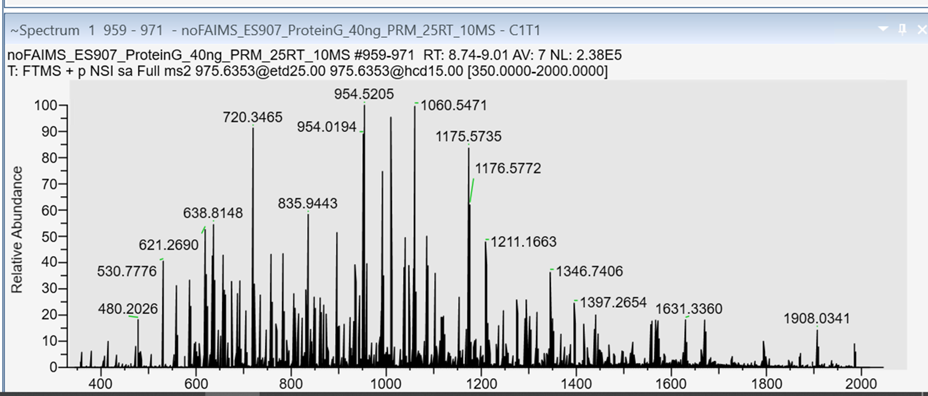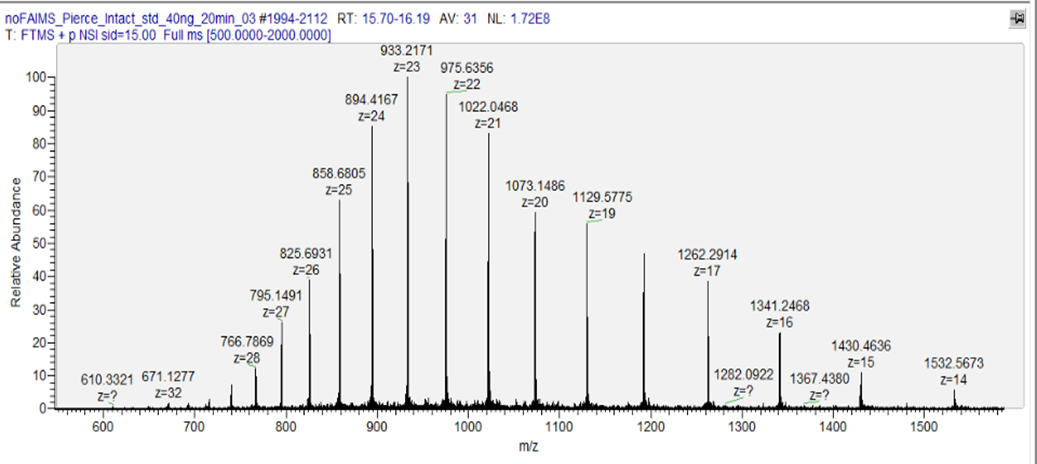 Pierce Intact Protein standard 에서 약 21kDa의 Protein G를 선택적을 분석해보았습니다. 아래는 Protein G의 MS1 Spectrum입니다. Peak들중에서 m/z 975.6356 (z=22)을 선택하여 PRM을 수행합니다. PRM 셋팅은 Bottom-up방법과 동일합니다.