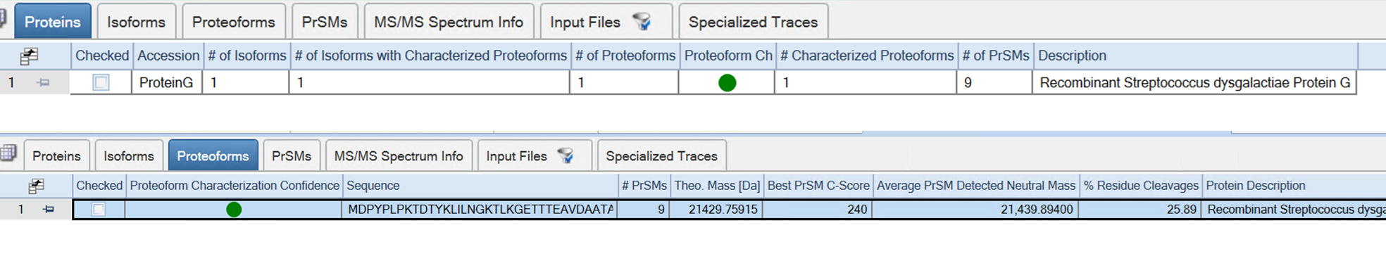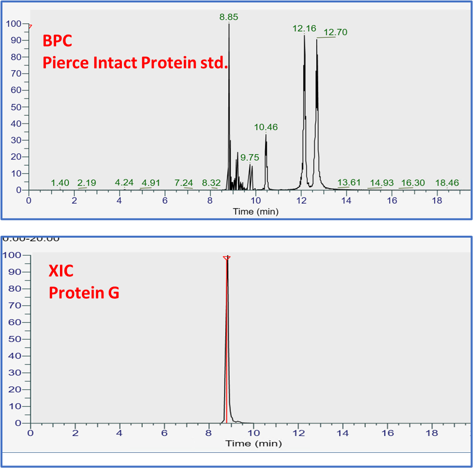 Proteome Discoverer 3.1 과 Prosight 4.3에서 PRM 파일 분석은 DDA와 동일하게 수행하였습니다. Pierce Intact Protein이 포함된 Sequence를 이용하여 검색하였지만 Protein G 한개의 단백질만이 정확히 검출이 되었습니다.