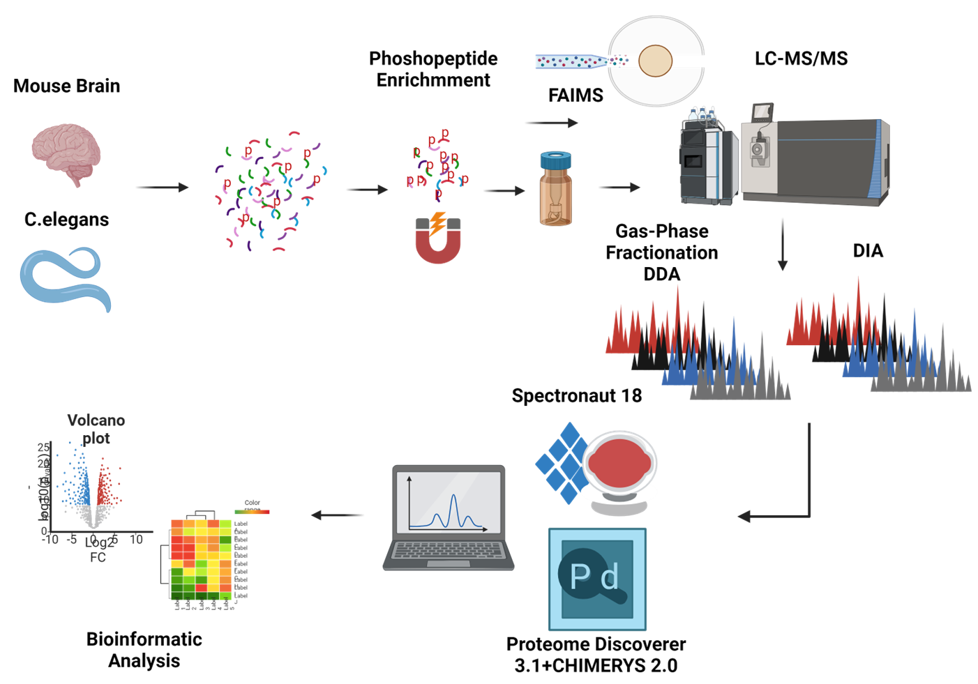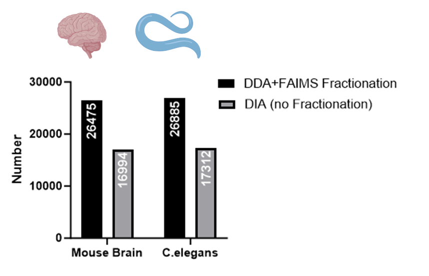 Mouse Brain과 C.elegans에서 Phopshopeptide를 Enrichment한뒤 FAIMS의 서로 다른 CV값에서 DDA로 분석하였습니다.
