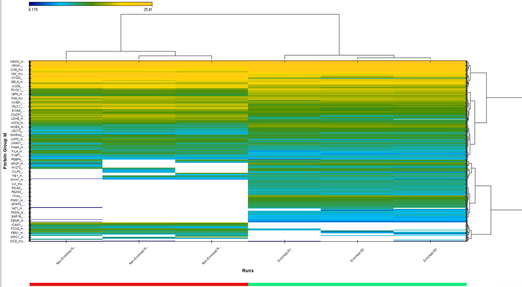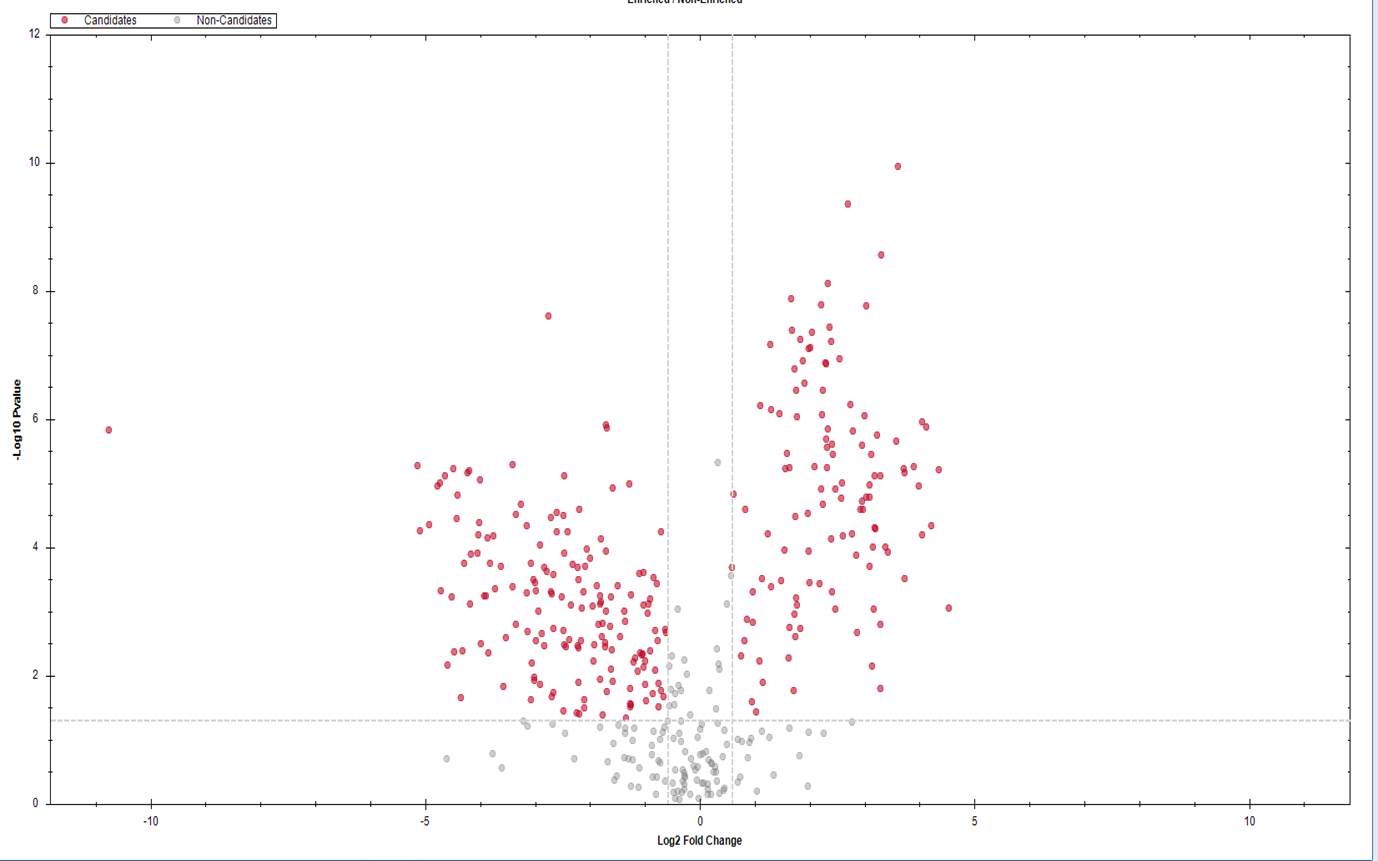 - Volcano Plot입니다. 동일한 시료를 사용하였지만 단백질의 양의 변화가 많습니다. Enrichmet되는 과정에서 단백질의 상대적인 양이 많이 변하였다는것을 알수 있습니다.