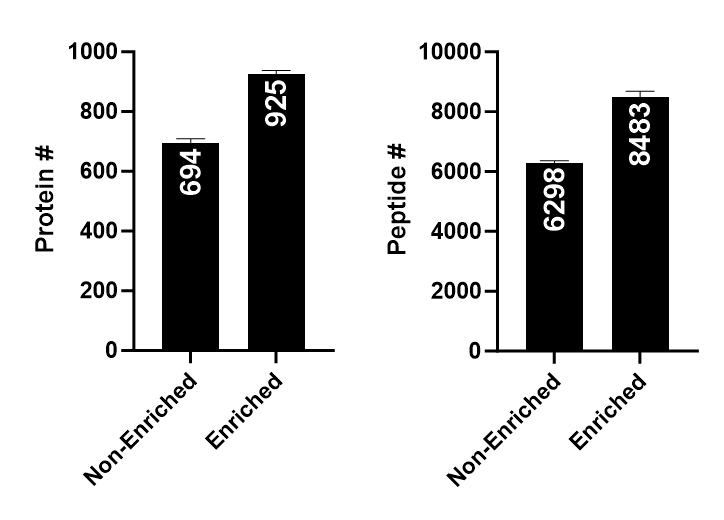 - 아래 그래프는 Enrichment를 한것과 하지 않은 시료를 DIA로 분석한후 얻어진 단백질과 펩타이드 수입니다. 큰 차이는 보이지 않지만 그래도 Kit를 사용후 더 많은 단백질이 검출되었습니다. 보통 Plasma의 경우 이 정도 수의 증가는 괜찮은 결과 일 수 있습니다.