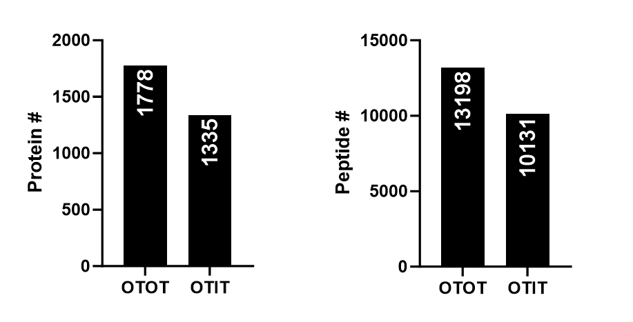 - -30V~-80V사이에서 5V 간격으로 총 11개의 분석을 하되 OTOT와 OTIT로 분석한후 PD3.1과 CHIMERYS2.0으로 분석하였습니다. 아래는 총 검출된 단백질과 펩타이드입니다. 예사외로 OTOT에서 더 많은 단백질이 검출되었습니다. 아마 CHIMERYS 는 OTOT에 더 최적화 되어 있는것 같습니다.