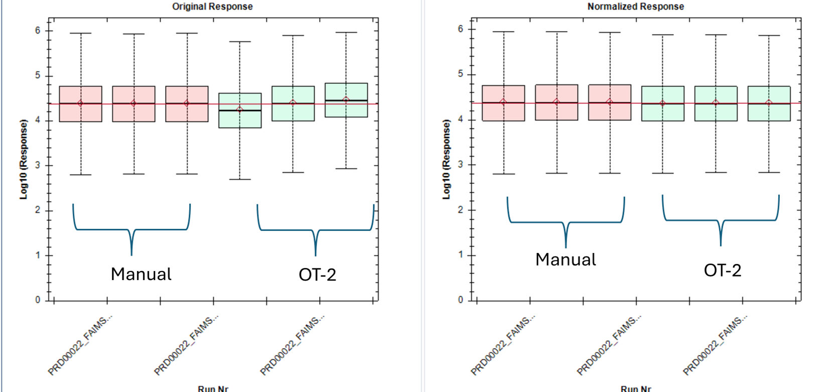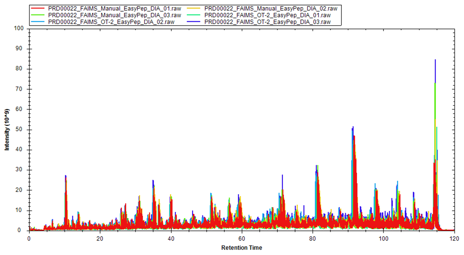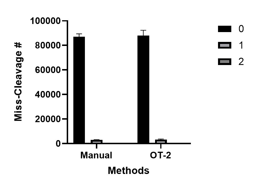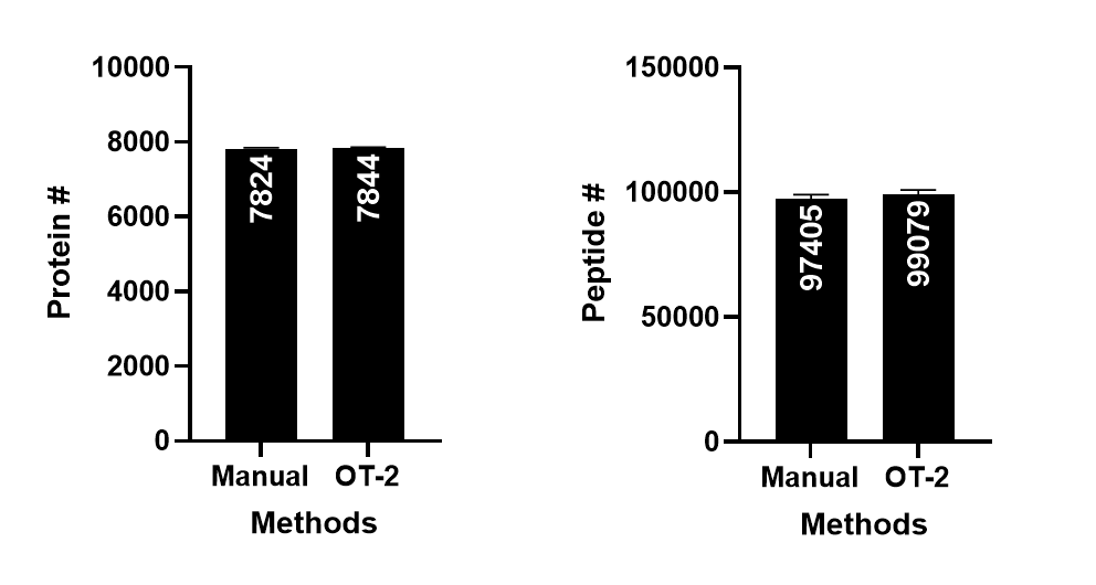 동일한 cell extract를 6개로 나누어서 OT-2 와 manual로 각각 Digestion을 한후 한 사람이 clean-up을 하였습니다. 각각의 시료는 DIA와 Spectronaut 18로 분석하였습니다.