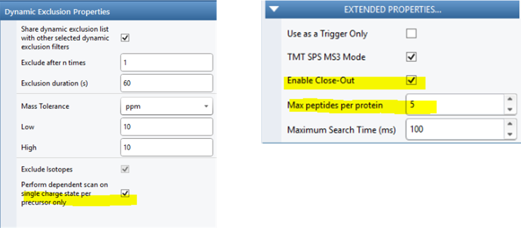 TMT MS3-RTS(Real Time Search)에는 Close-out 옵션이 있습니다. 분석중에 데이타베이스검색이 이루어지는 RTS에서 한개의 단백질당 검출하고자 하는 펩타이드의 수를 제한 할수 있습니다. 이 기능을 이용하면 농도가 높은 단백질에 해당하는 많은 펩타이드의 검출을 제한하는 대신 농도가 낮은 단백질의 펩타이드의 검출 가능성을 높일수 있습니다.