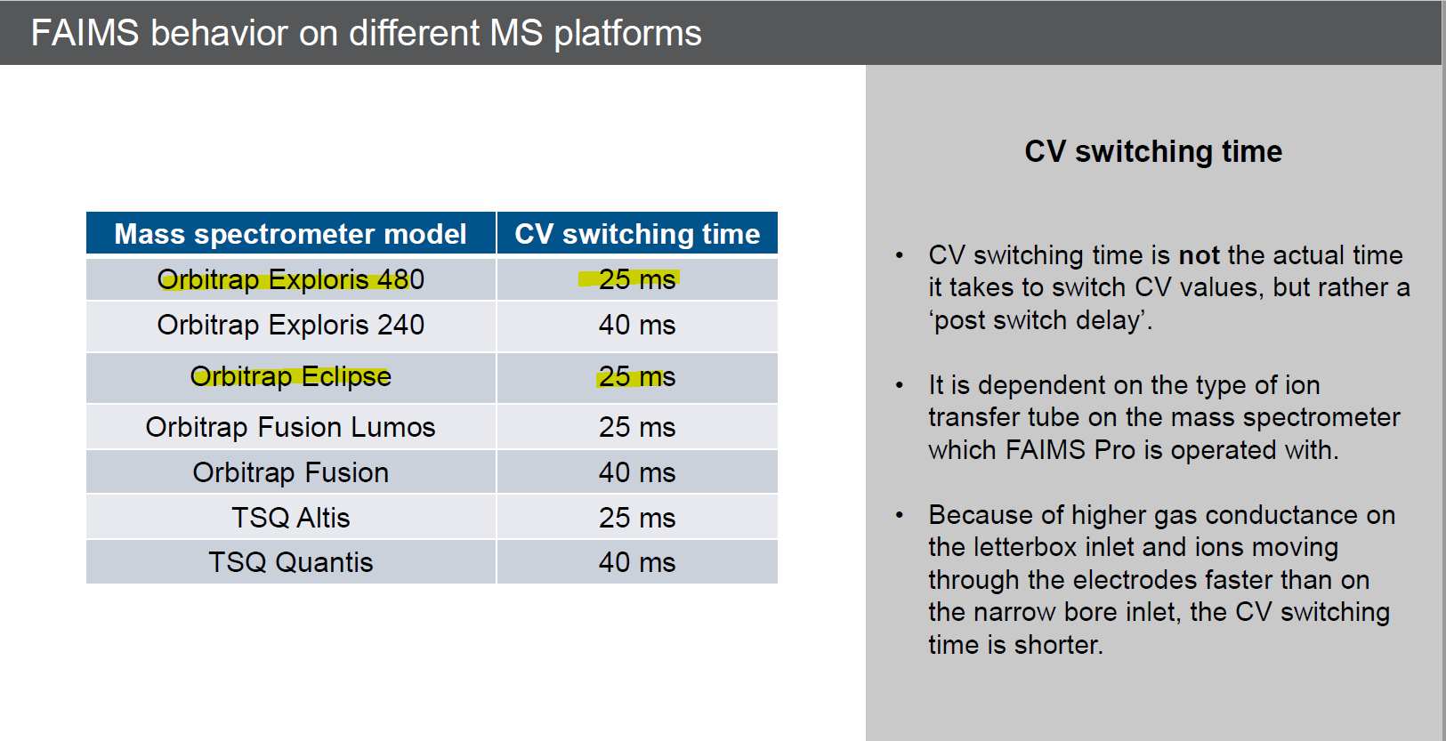 FAIMS 를 사용할때의 한가지 아쉬운점은 CV가 바뀌때 어느정도 시간이 소요된다는것입니다. 물론 큰 영향은 아닙니다. 하지만 DIA와 같은 정량분석에서는 Peak 당 point가 아주 중요합니다. FAIMS mode에서 CV 갯수가 늘어날수록 그 만큼 잃어버리는 시간이 있기 때문에 point가 줄어들수 있습니다.