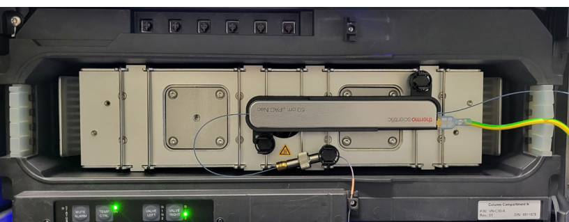 컬럼은 양쪽방향으로 모두 사용할수 있지만 양쪽의 tubing의 길이가 상당히 차이가 납니다. 이론적으로는 컬럼과 Source 사이의 길이가 짧은 것을 사용하는 것이 좋겠지요. 하지만 길이가 긴쪽을 컬럼 Outlet으로 사용하면 아래 그림과 같이 Vanquish Neo 의 column heater에 컬럼을 장착할수 있습니다.
