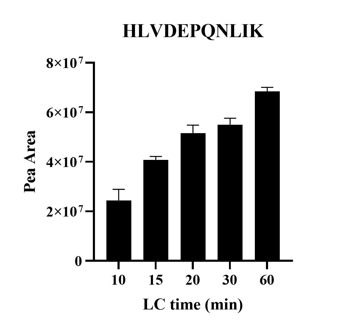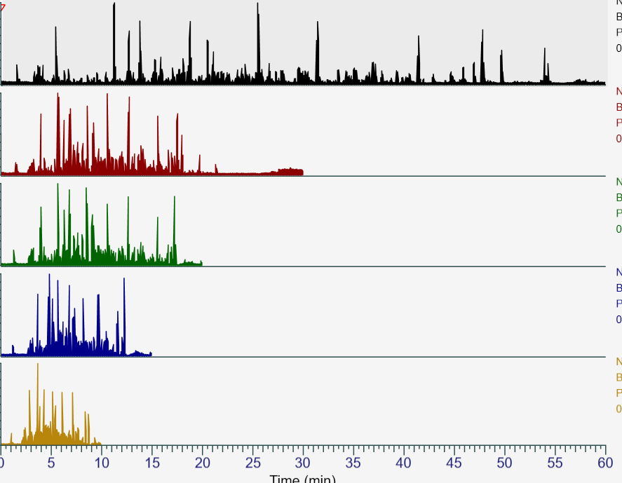 - 50ng HeLa에 BSA 500 amol spiking 후, 다양한 LC 시간(60, 30, 20, 15, 10분)으로 PRM 분석을 크로마토그램입니다.