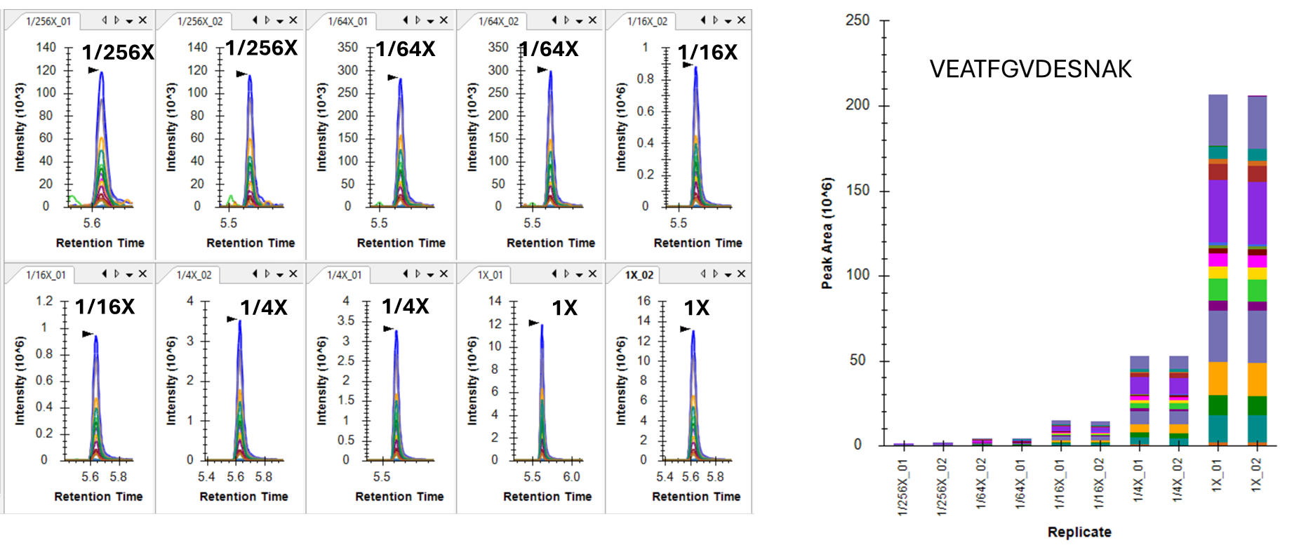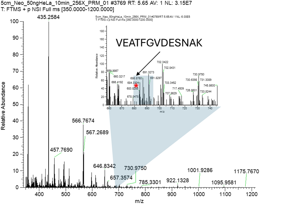 256X dilution한 시료의 경우 아주 낮은 MS1 intensity를 가지는 VEATFGVDESNAK도 10min PRM에서 잘 검출이 되었습니다.